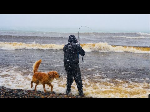 SHORE FISHING Lake Superior in a WINTER STORM (Hot Tent Camping with Biscuits and Gravy)